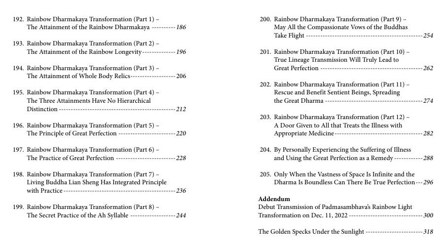 “The teachings of Great Perfection are the pinnacle of Tantrayana teaching, just as Mount Everest or Shengmu Feng in the Himalayas is the highest summit in this world. The ultimate fruition of Great Perfection Dharma is the rainbow body phenomenon. Padmasambhava transformed his body into a rainbow and vanished into empty space. In our school, we have the third highest achievement in Master Lianhua Yimin whose cremated body left behind a multitude of sariras. The second highest achievement is the body transforming into rainbow light, with clothing, hair, fingernails and toenails left behind. That is why Great Perfection teachings are the highest teachings.”